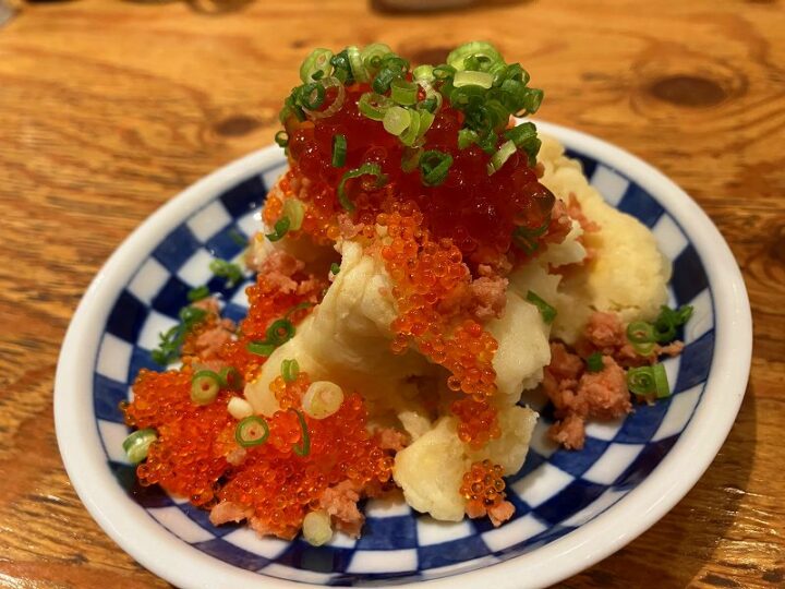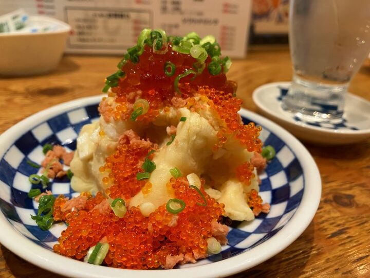 寿司屋のポテサラは、ジャガイモの食感をしっかり残したタイプで、上にいくらとトビッコがたっぷり。口の中でプチプチとはじけ、贅沢な味わいを作り出していた。
