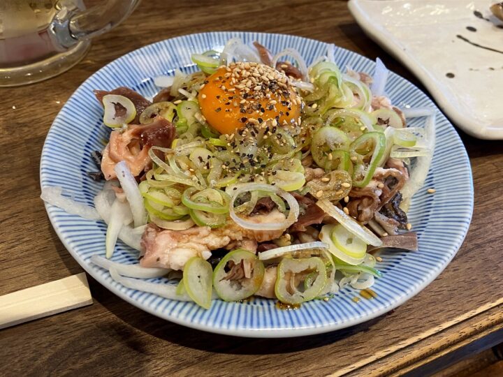 ネギたっぷりのホルモンが来た。ぷりぷり、コリコリ。食感がクセになる一皿。