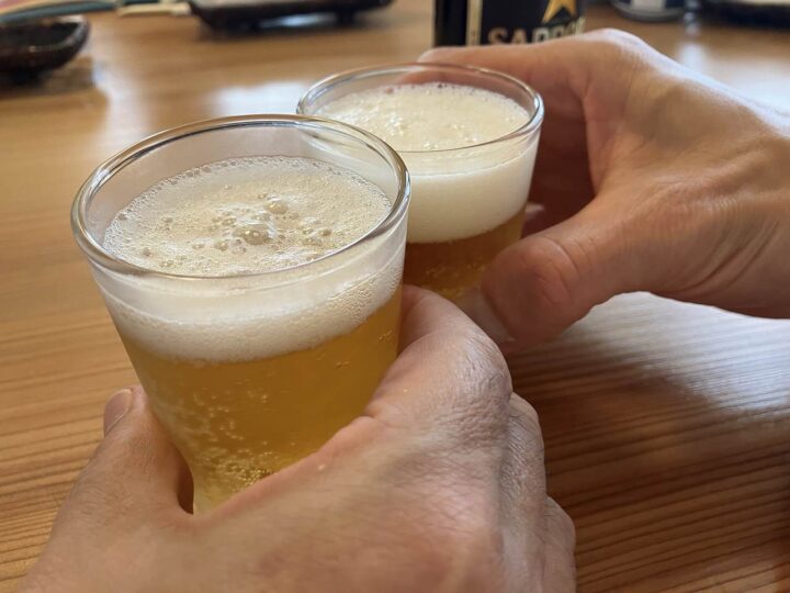 グラスが触れ合う軽い音。冷たいビールで最初のひと呼吸。