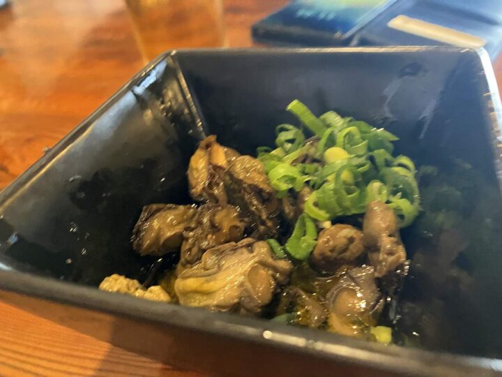つまみは牡蠣のオイル漬けにさば麹の炙り。