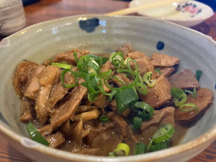 まぐろ切り身の煮つけ。甘辛の味付け。ここでまた酒が進む。