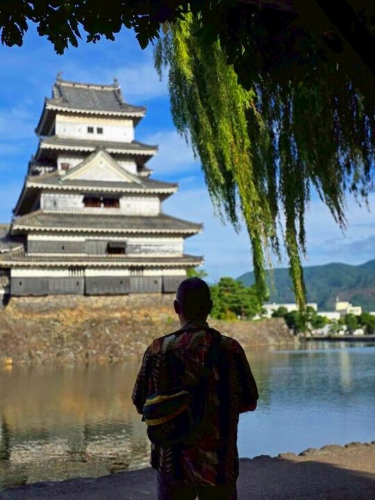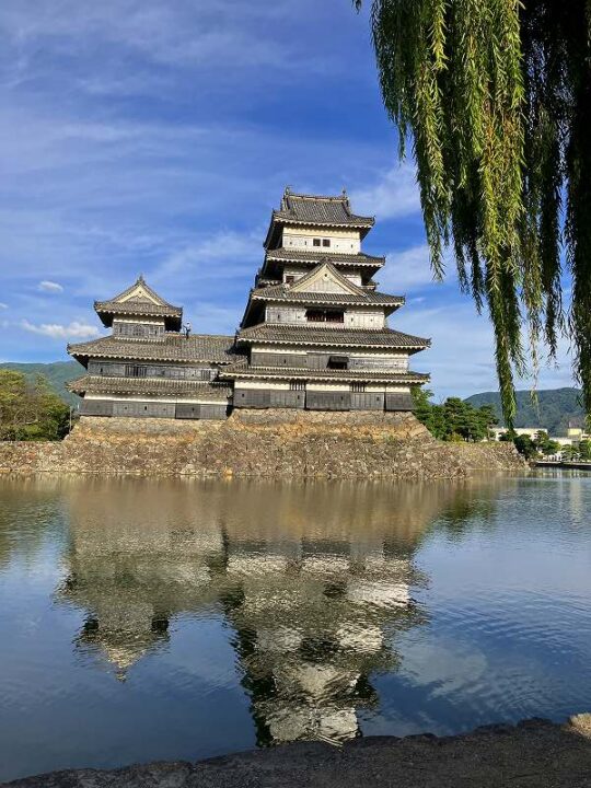 柳越しに、堀に映る城も良い感じ。松本城は角度によって魅力を変える。