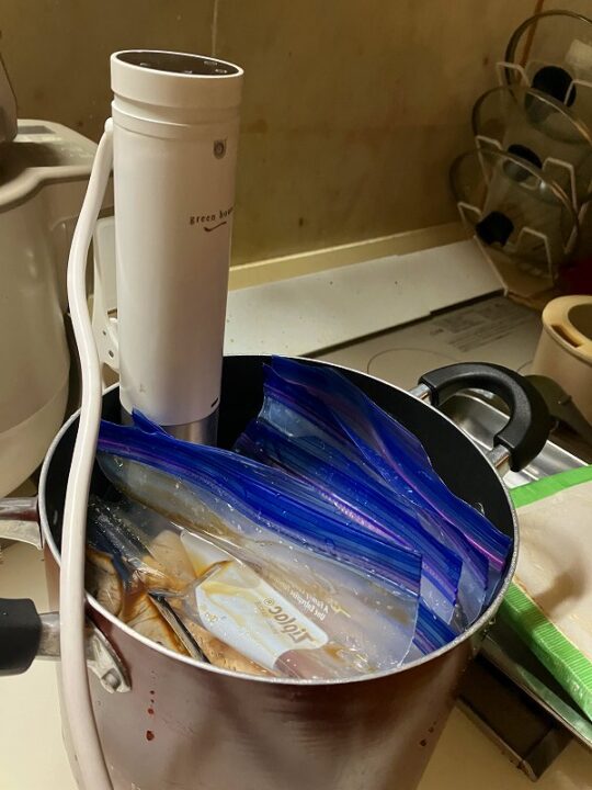 早速購入して、低温調理。いつもの酢ではなく、ブライン液に漬けてみた。