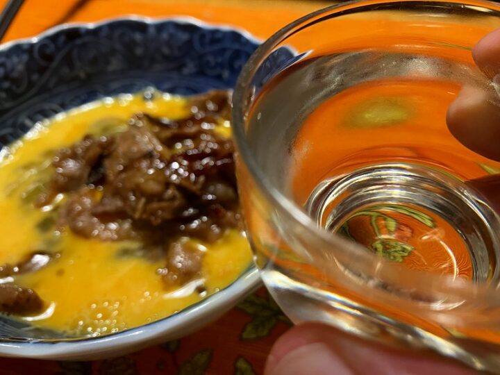 玉子にくぐらせた牛肉はたまらなく酒に合う。