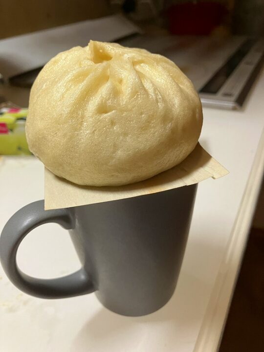 - カップの上に肉まんをのせ、ふんわりラップをかける。