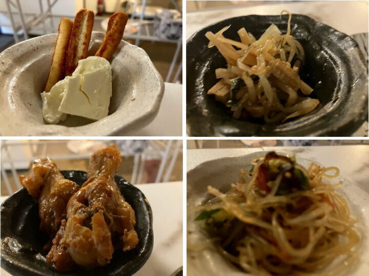 4つの小鉢。チーズ、鳥のうま煮、春雨サラダ、切り干し大根。どれも気取らず美味しかった。