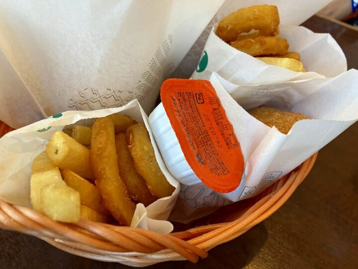 オニオンフライは、玉ねぎが甘くてサクサク。ポテトも熱々で、塩加減がちょうどいい。