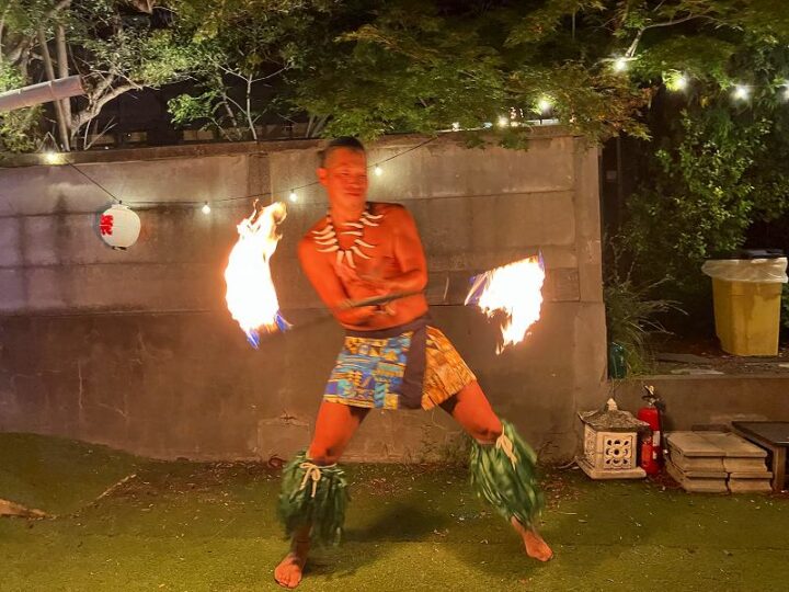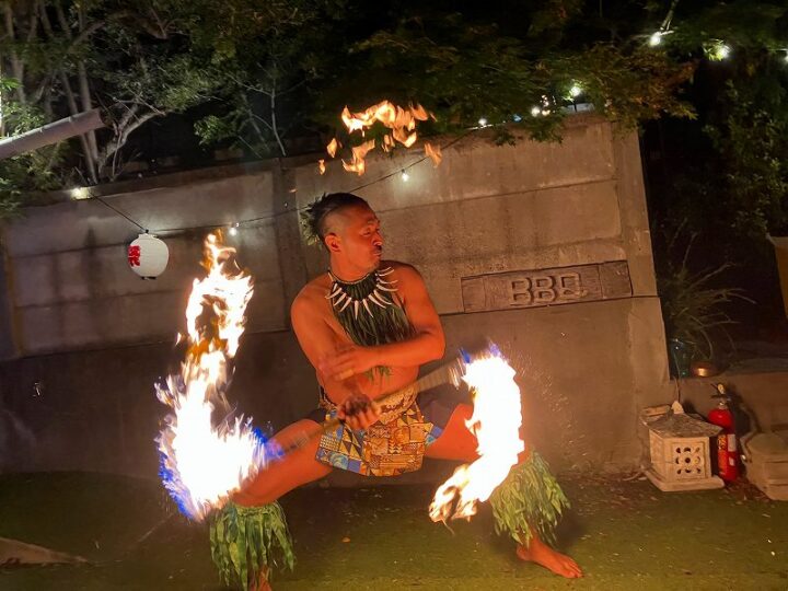 続いてファイヤーナイフダンス。闇夜を炎が切り裂き、迫力満点。