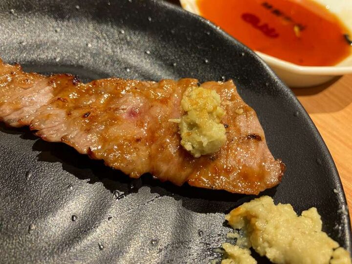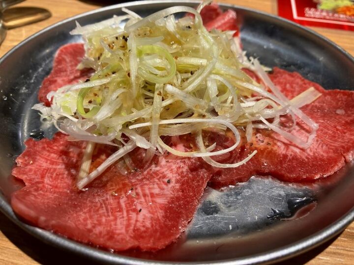 上塩牛タンの美しいサシ。レモンを絞ってさっぱりと。