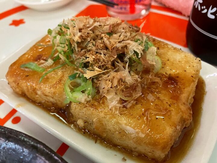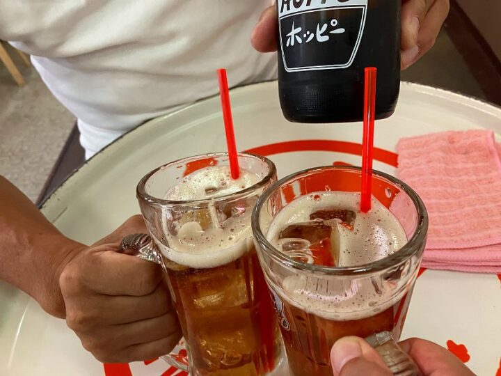 最初の一杯はホッピー黒で乾杯。軽い苦みとコクのある味が体にしみた。
