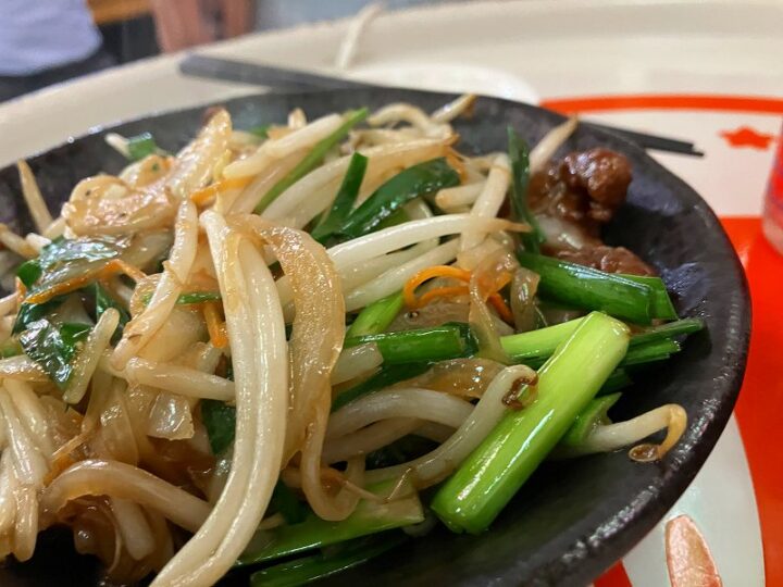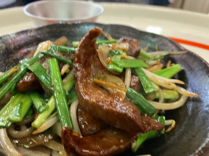 つまみにはレバニラ炒め。濃いめの味付けが、ホッピーに合う。