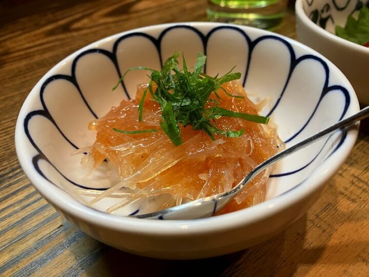 梅水晶おろし。サメ軟骨のコリコリとした食感に、大根おろしと梅の酸味がよく合う。