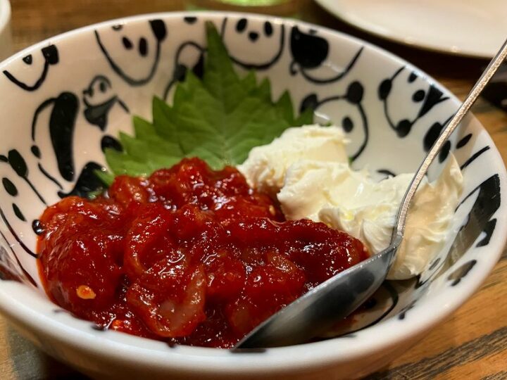 チャンジャクリームチーズ。濃厚なコクにピリッとした辛さが重なり、これもまた絶妙なバランス。