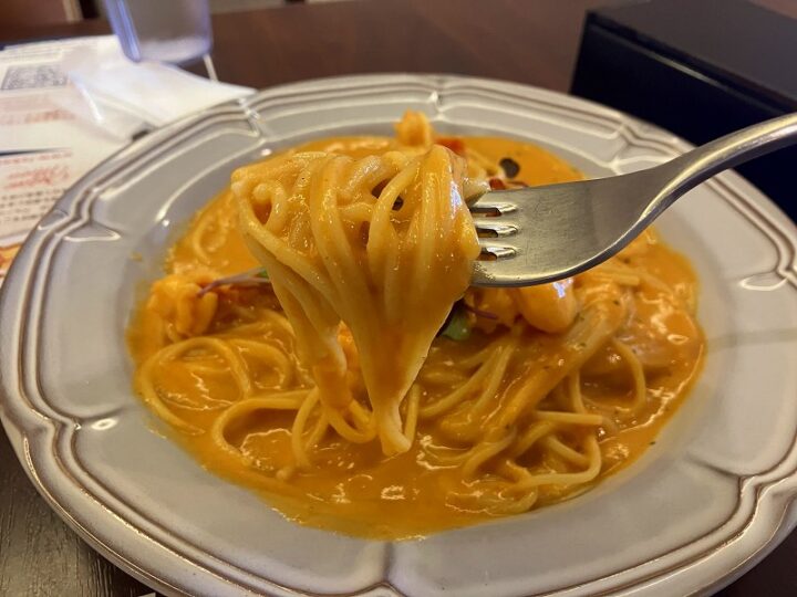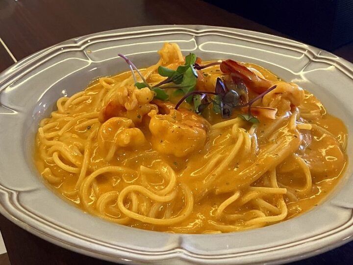 スパゲッティ・コン・ランゴスティノスは、エビがたっぷり入ったクリームソースパスタ。