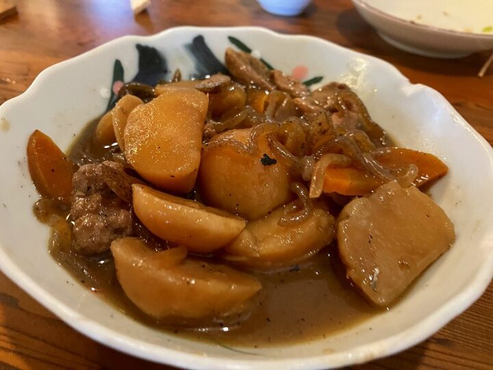 ツマミは手造り肉じゃが。そば屋のつゆで煮込まれた深い味わい。