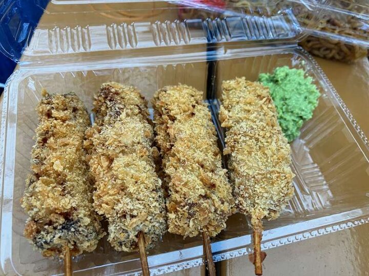 ジューシーな漬けマグロの串カツは、外はサクッと中はしっとり。口に広がる旨みがたまらない。