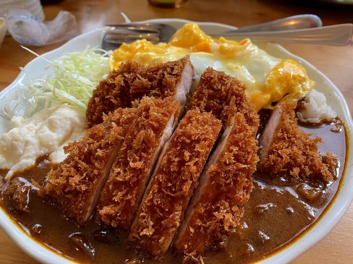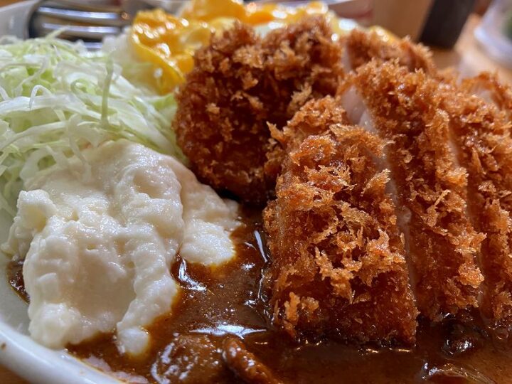スパイスの香りが立つカレーと、揚げたてのとんかつ。
