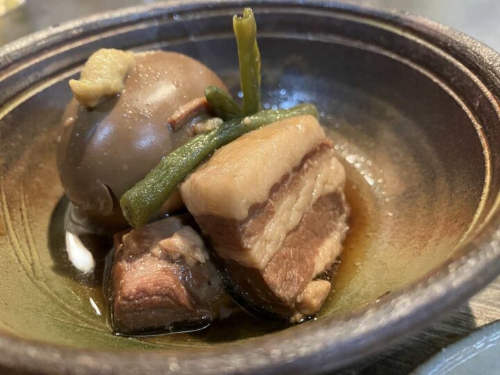 お通しの豚角煮と煮たシイタケは、口のなかでほどける旨み。