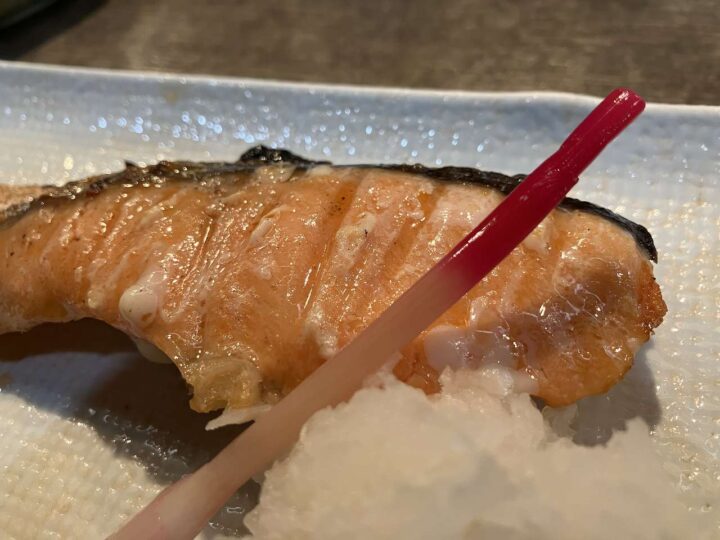 北海道直送の生鮭焼きは、炭火で際立つ脂の甘み。
