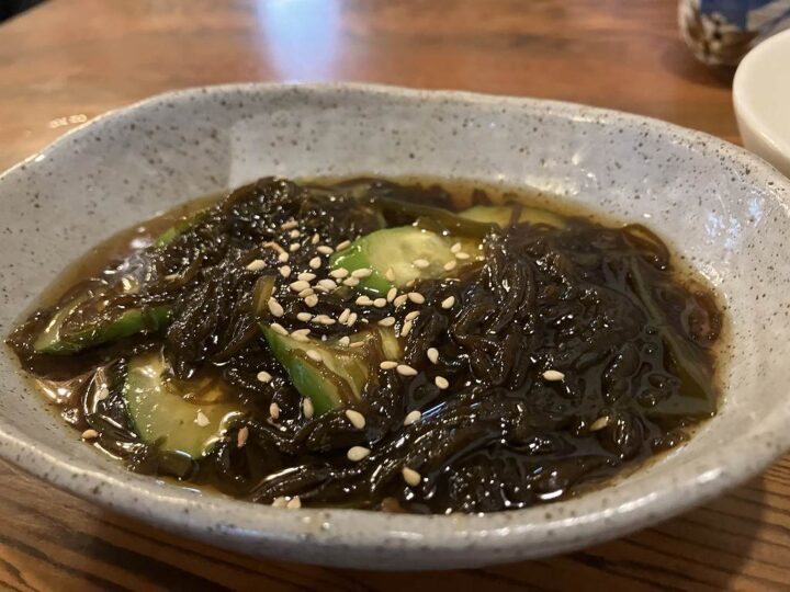 もずくときゅうりの酢の物。すっきりした酸味が口の中をリセット。