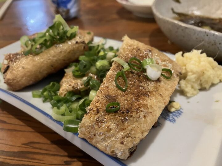 油揚げの包み焼。香ばしい香りとほどよいコク。純米酒の旨味と響き合う満足感。