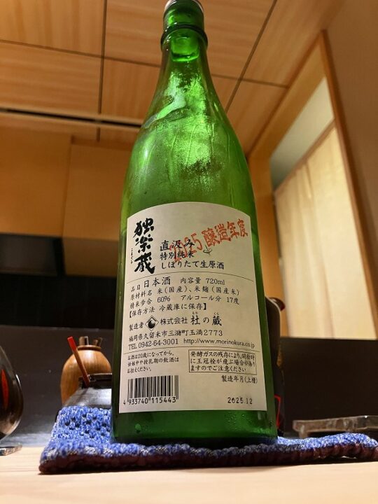 無濾過を希望すると、久留米の独楽蔵 直汲みしぼりたて生原酒。