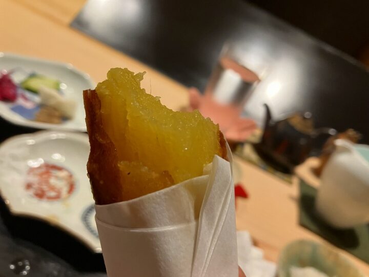 手持ちで食べるサツマイモの甘いこと。