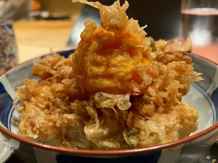 選べる〆のお食事は、かき揚げどんぶり。トロトロの黄身がたまらない。