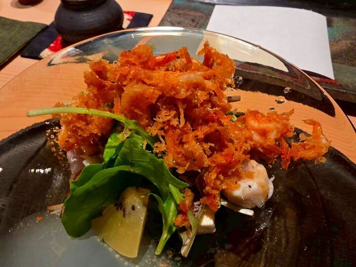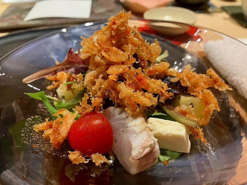 クエを使った小エビ天ぷらのサラダは、流れを整える一皿。