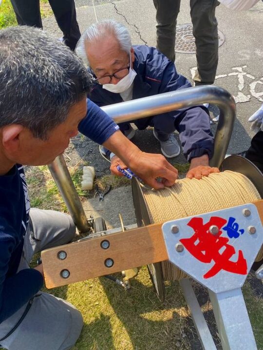 今回は、馬込川の堤防で親糸を伸ばしながら凧糸の糸枠巻き込みを行った。
