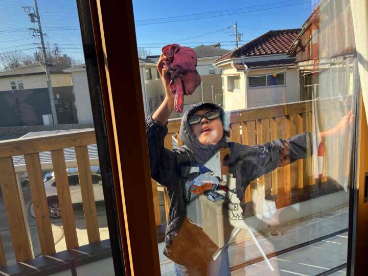 窓掃除を手伝う孫の姿。3D観賞用のサングラスをかけ、背伸びしながら、ガラスを磨く。
