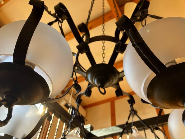 中世の古城を思わせる、独特の意匠が印象的で、重厚な黒鉄のフレームと、ガラスの輝きのコントラストが、空間に強い存在感を与える。