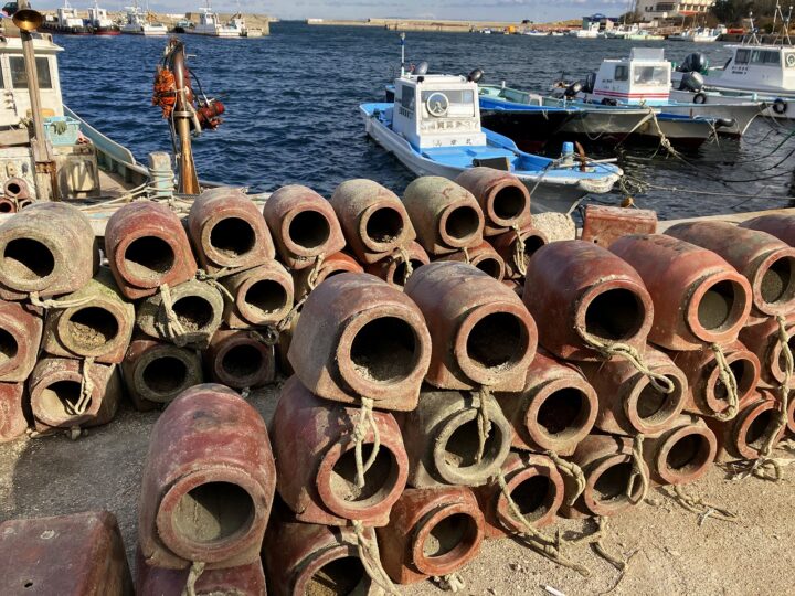 あっちこっちにタコつぼ。下面が平らになっている。
