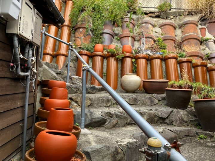 丸みのあるカメ壺が、石畳のように連なる道。用途を終えた器の第二の人生。触れずとも伝わる、手仕事の温度。